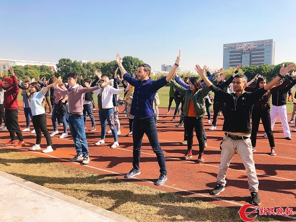 图说:留学生们在伟德国际victor1946官网操场上学习养生功法 新民晚报记者 左妍摄