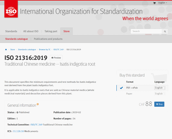 板蓝根药材的ISO 国际标准是在我国药典标准的基础上,遵循ISO国际标准编制规则,主要从种源、范围、定义、技术要求及检验规则等方面开展标准制定工作,且根据国际市场的要求,合理规定了部分农药和重金属控制指标。