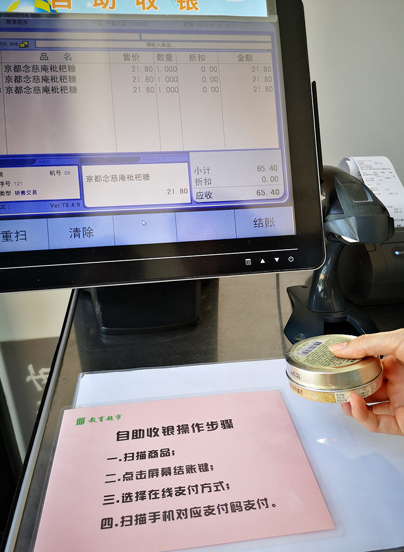 现场可见,实践园除了向创业学子提供自主经营店铺,还吸引了已毕业的创业博士回校开设小儿推拿形象店。此外,园区内配置了高科技仪器和设备,并融入“五行”“五色”“五禽戏”“太极”“八卦”等中华传统文化元素,还开放无人收银、自助扫码的教育超市开展诚信教育。
