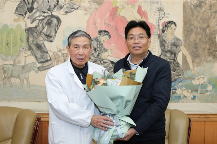 张怀琼、徐建光关切询问朱老的身体、工作和生活情况,对朱老长期以来对中医药事业的发展、中医妇科学科建设、朱氏妇科的传承所作的卓越贡献表示感谢,并送上蛋糕和祝福,为朱老提前庆贺百岁生日,祝愿朱老健康长寿。朱南孙指出,要遵循中医药发展规律,坚持中西医并重,传承创新,更好发挥中医药在疾病防治中的作用,造福更多患者。