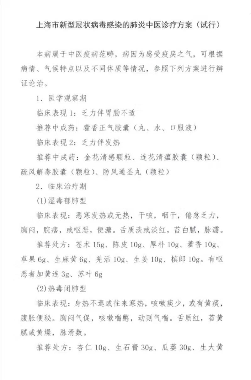 附:《上海市新型冠状病毒感染的肺炎中医诊疗方案(试行)》