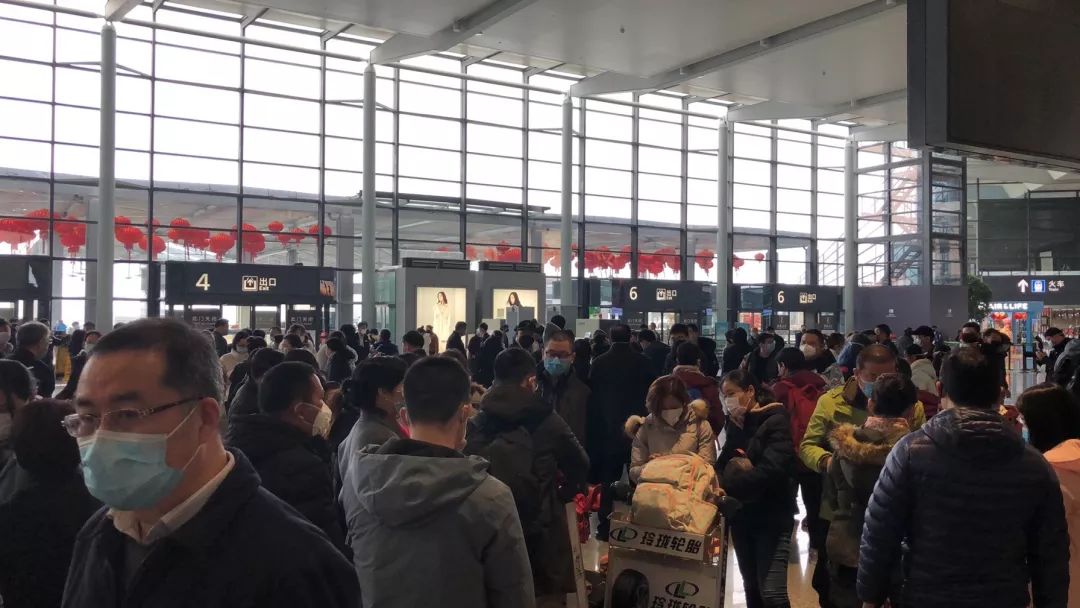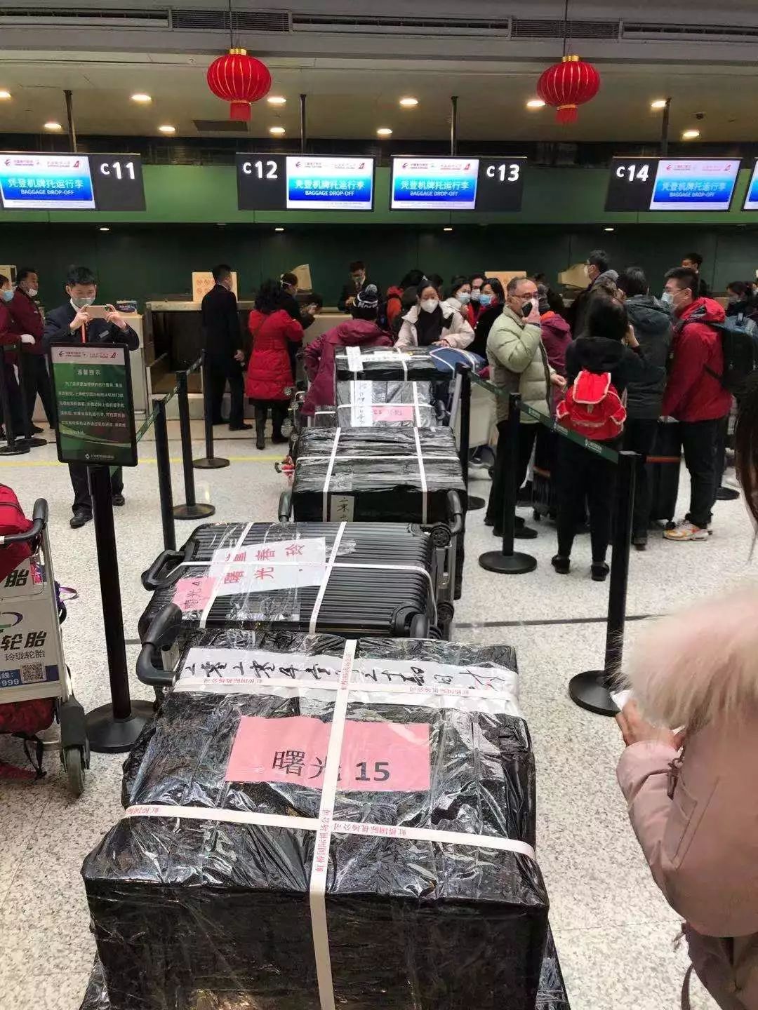 一件件的行李和物资正在排队托运,人声鼎沸的虹桥机场↓