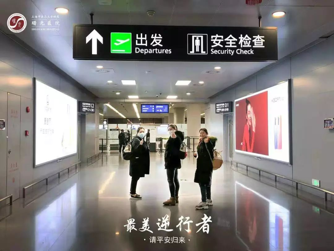 △曙光医院党委书记马俊坚、副院长冯煜、副院长竺炯等前往虹桥机场,为3位医疗支援队员送行