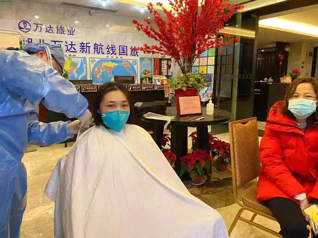 2月2日,酒店有理发师进驻,上海第二批援鄂医疗队队员附属第九人民医院重症监护室(北部)护士长黄波黎第一个报了名。