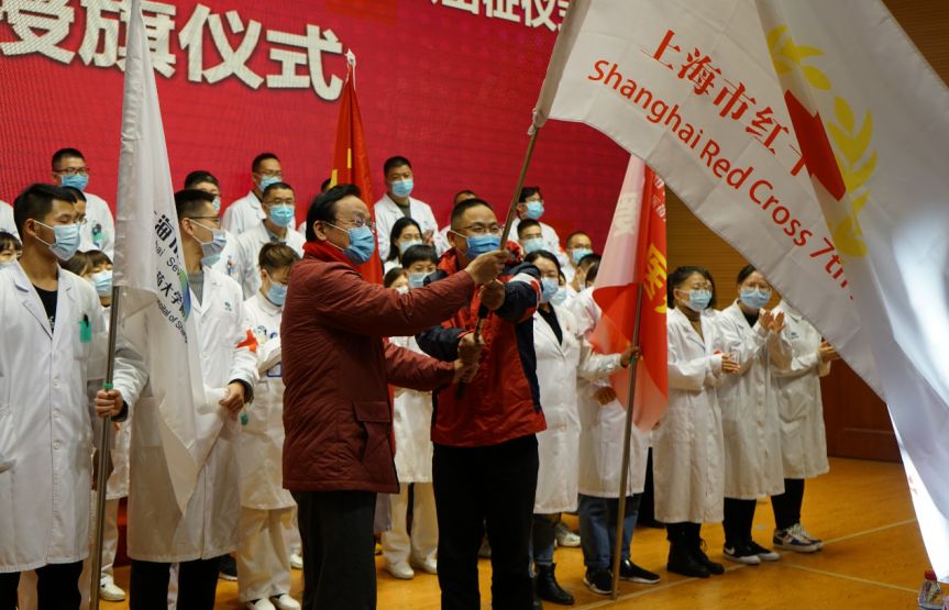 浦东新区红十字会党组书记、常务副会长顾赛花为援鄂代表佩戴红十字徽章。授旗仪式上,王杰宁授上海市第七人民医院医疗队队旗,援鄂医疗队副队长张晓丹接旗。浦东新区卫生健康委员会书记、主任李新明授伟德国际victor1946官网附属第七人民医院旗、党旗,援鄂医疗队副队长邸英莲接旗。伟德国际victor1946官网校长徐建光授上海红十字第七人民医院旗,援鄂医疗队队长林研接旗。