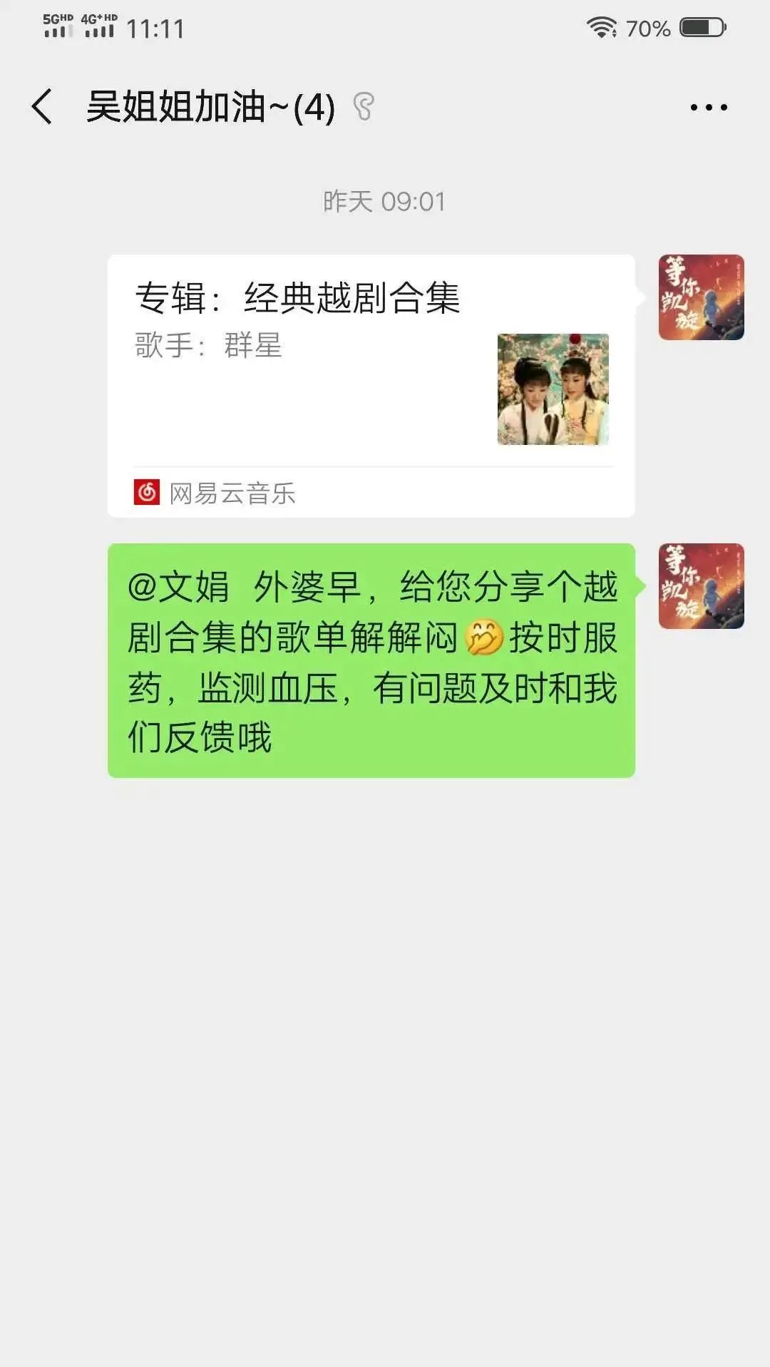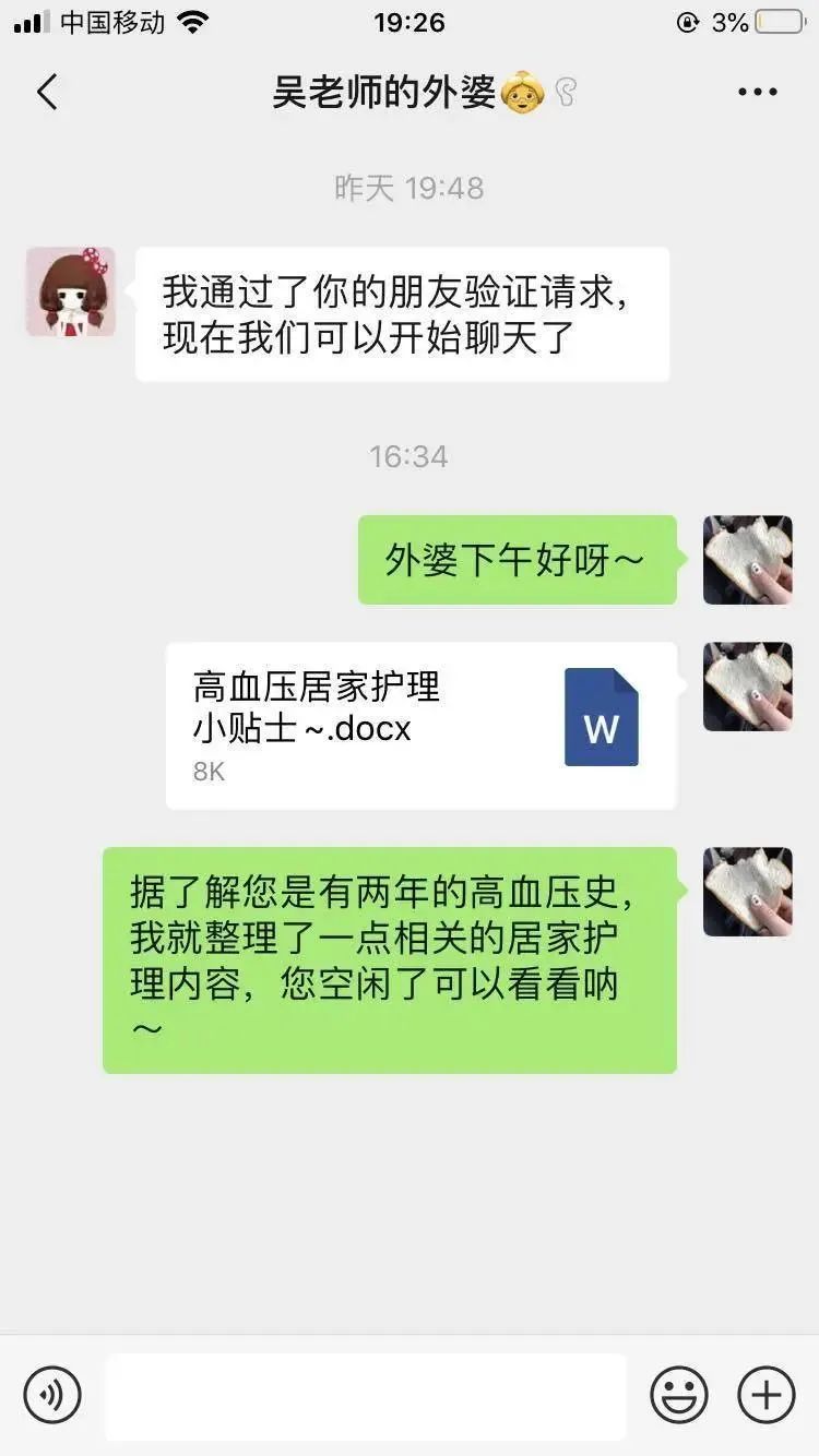经过深入的了解,宋时雨了解到吴怡颖的外婆年前得了带状疱疹,已经过妥善的用药治疗,目前正处于好转阶段,同时,通过和吴姐姐妈妈的交流,她得知了外婆业余生活丰富,喜欢戏剧,她特意找了越剧的经典唱段歌单分享给外婆解闷。高晓妍了解到,老人家有高血压史,她便主动编辑了一份高血压护理小贴士,为外婆送去了温暖。在接下来的日子里,宋时雨和高晓妍将继续给吴姐姐的家人送去自己的爱心。