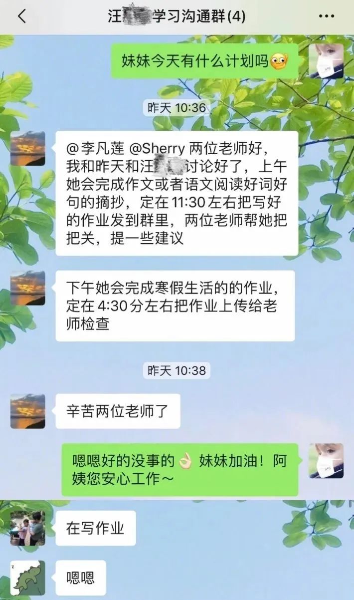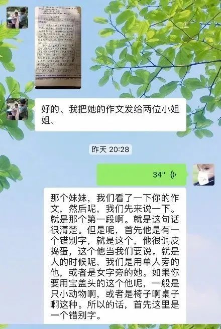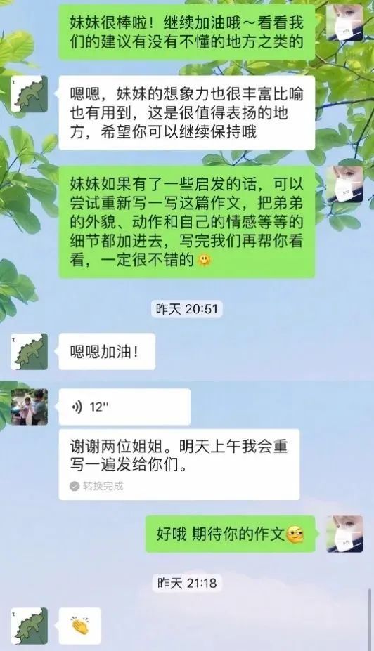服务的第一天,沈智灵和李凡莲对孩子的作文提出了建议,积极与家长沟通,尽可能用专业的语言、亲切的语气指导孩子,也上网找了一些拓展内容,希望能帮助到孩子,激发她的学习兴趣,这份努力和用心获得了家长的好评。