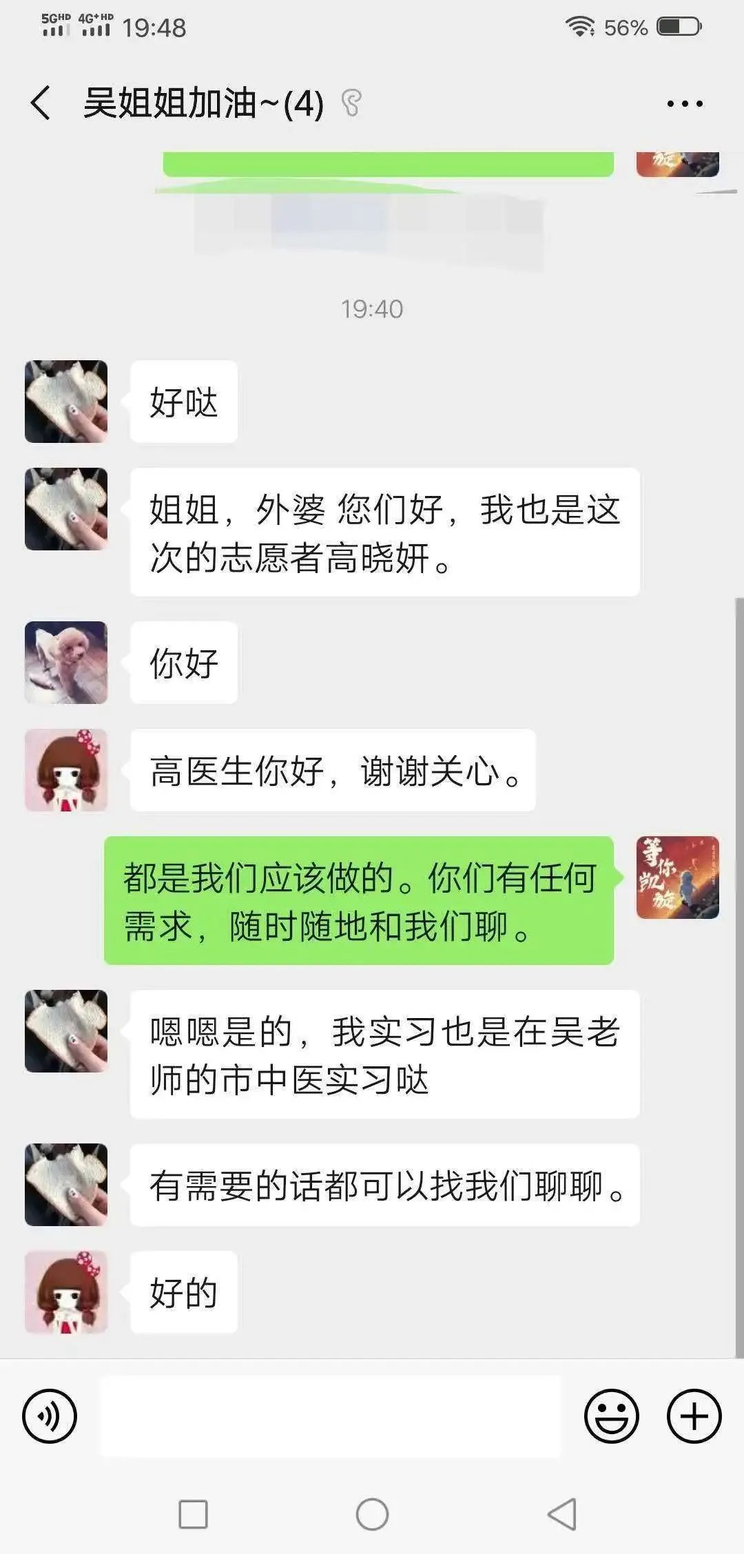通过电话沟通,她们了解到吴怡颖此刻正支援武汉前线,更时刻牵记着独自一人居住的外婆。在挂断电话以后,宋时雨和高晓妍迅速组建了微信群组,命名为“吴姐姐加油~”,随时随地给吴怡颖的家人提供帮助,陪伴她们聊天。