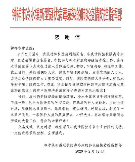 “向周继同志表示最诚挚的感谢,感谢他主动请缨参加钟祥市冷水镇疫情防控工作……”这是湖北省钟祥市中医院精神科主治医师周继家乡的疫情防控指挥部写给他的感谢信。感谢他坚守在农村疫情防控的第一线。