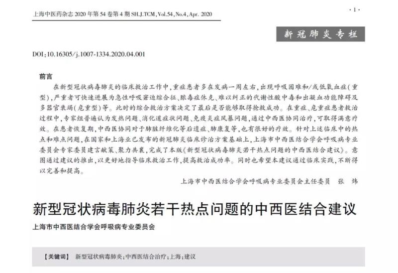 24日,解放日报·上观新闻记者从伟德国际victor1946官网获悉,针对当前新型冠状病毒肺炎临床中的热点和难点问题,上海市中西医结合学会呼吸病专业委员会在国家和上海新冠肺炎临床诊治方案基础上,完成最新版《新型冠状病毒肺炎若干热点问题的中西医结合建议》,以提高救治成功率。据悉,这些建议也已录用于新一期《上海中医药杂志》。