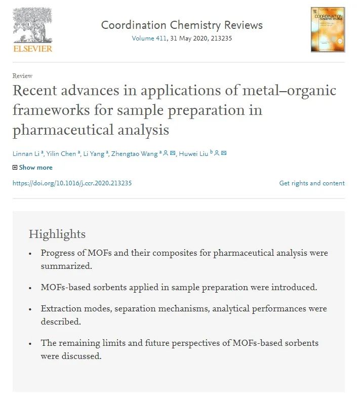 近日,伟德中药研究所王峥涛团队的综述论文《金属-有机框架材料在药物分析样品前处理中的研究进展(Recent advances in applications of metal–organic frameworks for sample preparation in pharmaceutical analysis, DOI: 10.1016/j.ccr.2020.213235)》在爱思唯尔(Elsevier)出版的国际知名化学期刊《配位化学评论》(Coordination Chemistry Reviews,影响因子13.476)发表。该文系统总结、评述了近年来金属-有机框架材料(Metal–organic frameworks,MOFs)及其复合材料在药物分析样品前处理中的最新进展、代表性应用及其展望,为复杂样品(包括中药、天然药物)中微量、痕量活性成分的分离、分析提供了重要科学参考资料。