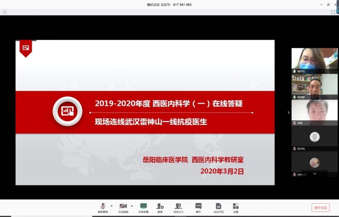 3月2日早上,龙华临床医学院和曙光临床医学院的《中医内科学》、岳阳临床医学院和市中医临床医学院的《西医内科学》、岳阳临床医学院的《中医外科学》、护理学院《内科护理学》课程通过教学干事和助教,分时段连线到了每一位老师,让同学们借助网络平台,又见到了熟悉但又有些不一样的方邦江老师、宋秀明老师、李斌老师、樊民老师、冯其茂老师、卢根娣老师。学生们不仅能听到老师的讲授,还能和老师在线互动。