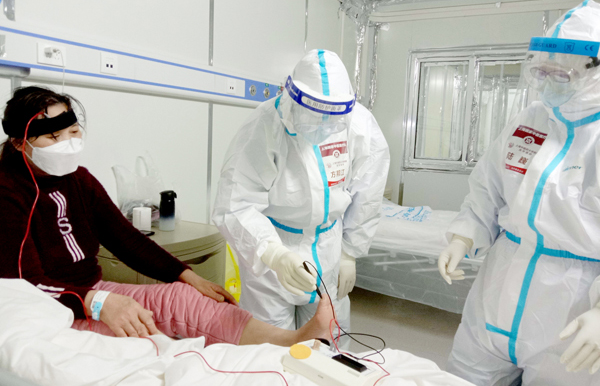 图为方邦江(中)使用经络诊断治疗仪为患者治疗。尹晓静摄