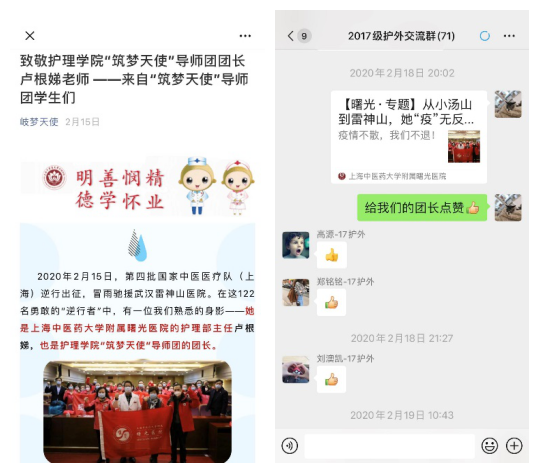 护理专业在这场抗疫中,显现独特的专业价值和职业魅力。学校系统在鄂、在沪抗疫的医护人员,护理学院支援武汉抗疫的诸多校友的感人事迹,都是护理学生职业教育的重要契机和可贵资源。各班辅导员及时将抗疫护理人的事迹报道转发给学生,并适时开展职业教育引导。护理专业课《内科护理学》3月2日的第一堂网课,现场连线了在武汉抗疫的曙光医院护理部主任、护理学院导师团团长卢根娣、龙华医院肺病科护士长甄暐、第七人民医院护理部副主任邸英莲,这三位临床护理老师为学生直播讲课。这些抗疫护理人的真人真事使护理职业教育更有了家国大义的珍贵内涵,真情实感地教育学生、感召学生、引导学生。