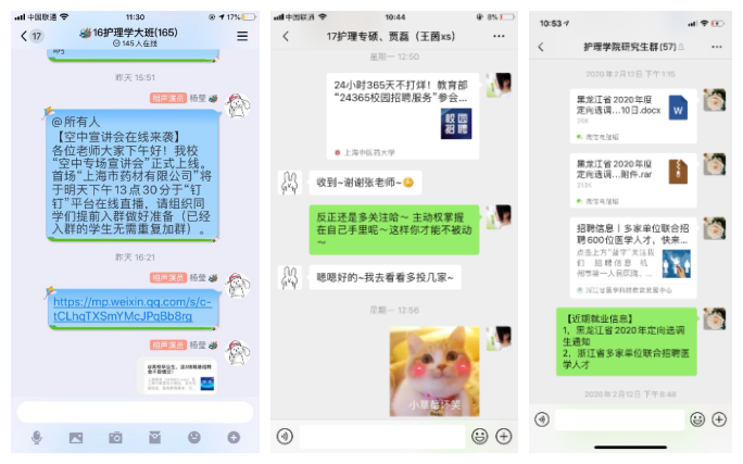 护理学院在前期有序推进就业工作的良好基础上,面对疫情影响,创新就业教育指导工作方式,对毕业班学生开展“云服务”线上就业工作,并结合护理专业特色,充分发挥疫情抗战一线护理人感人事迹的育人作用,加强学生就业教育引导。目前,护理学院2020届毕业班学生中有约30%学生落实就业岗位,其中,十名应届毕业研究生已落实就业岗位。