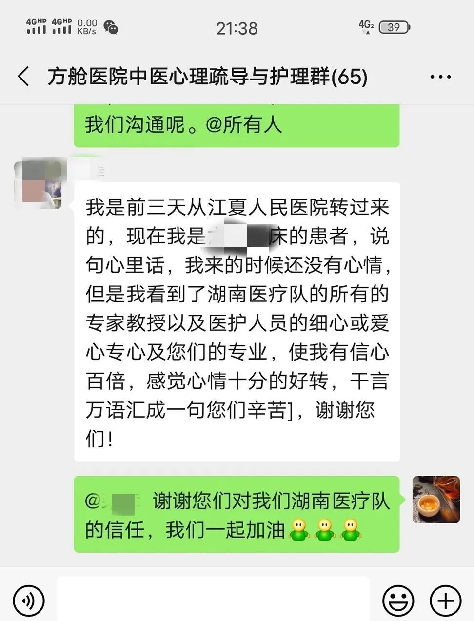 同时,心理护理小组对每个患者进行心理测试,让他们了解自己的精神状况;建立“中医心理疏导”微信群聊,密切关注患者的情绪问题。24小时在线接受患者的心理咨询求助,通过心理量表测量,及时掌握患者心理活动变化,进行积极干预。经过一段时间的精心照顾,患者们都十分信任医疗队队员。