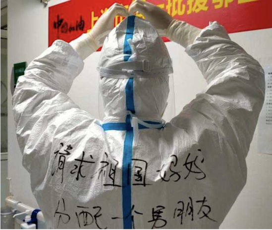 正因为诸玫琳对患者家人般的体贴和开朗的性格,不少重症病房的患者都把她当作自家的闺女。一次喂饭时,一位患者主动问起诸玫琳有没有男朋友,听说还没有时,这位患者主动说:“那我帮你找男朋友,我看网上有护士在防护服上求男友,我也帮你写一个。”说罢,拿起笔在诸玫琳的防护服上写道:“请求祖国妈妈分配一个男朋友。”