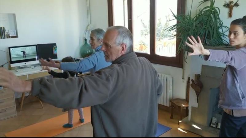 在西班牙巴塞罗那,上海气功研究所气道书院外籍学员、西班牙欧洲中医基金会学员及当地人士,祖孙三代居家习练八段锦等中华传统养生术。