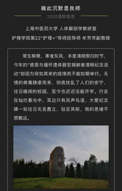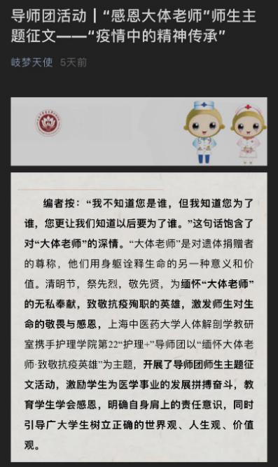 护理学院“护理+”导师团充分挖掘育人元素,以“感恩大体老师”为主题开展生命教育。来自导师团的牟芳芳老师、人体解剖室的秦真侠老师、辅导员张倩倩老师等,写下动人故事,教会学生敬畏生命,学会感恩。