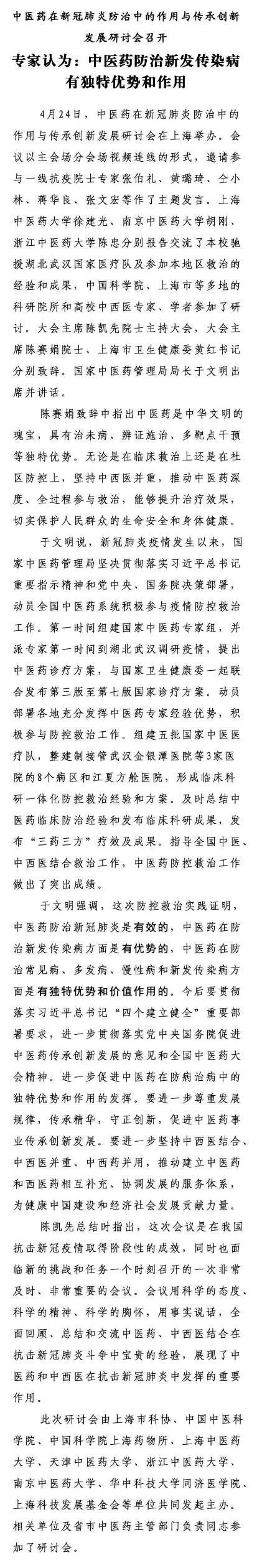 中国中医:中医药在新冠肺炎防治中的作用与传承创新发展研讨会召开