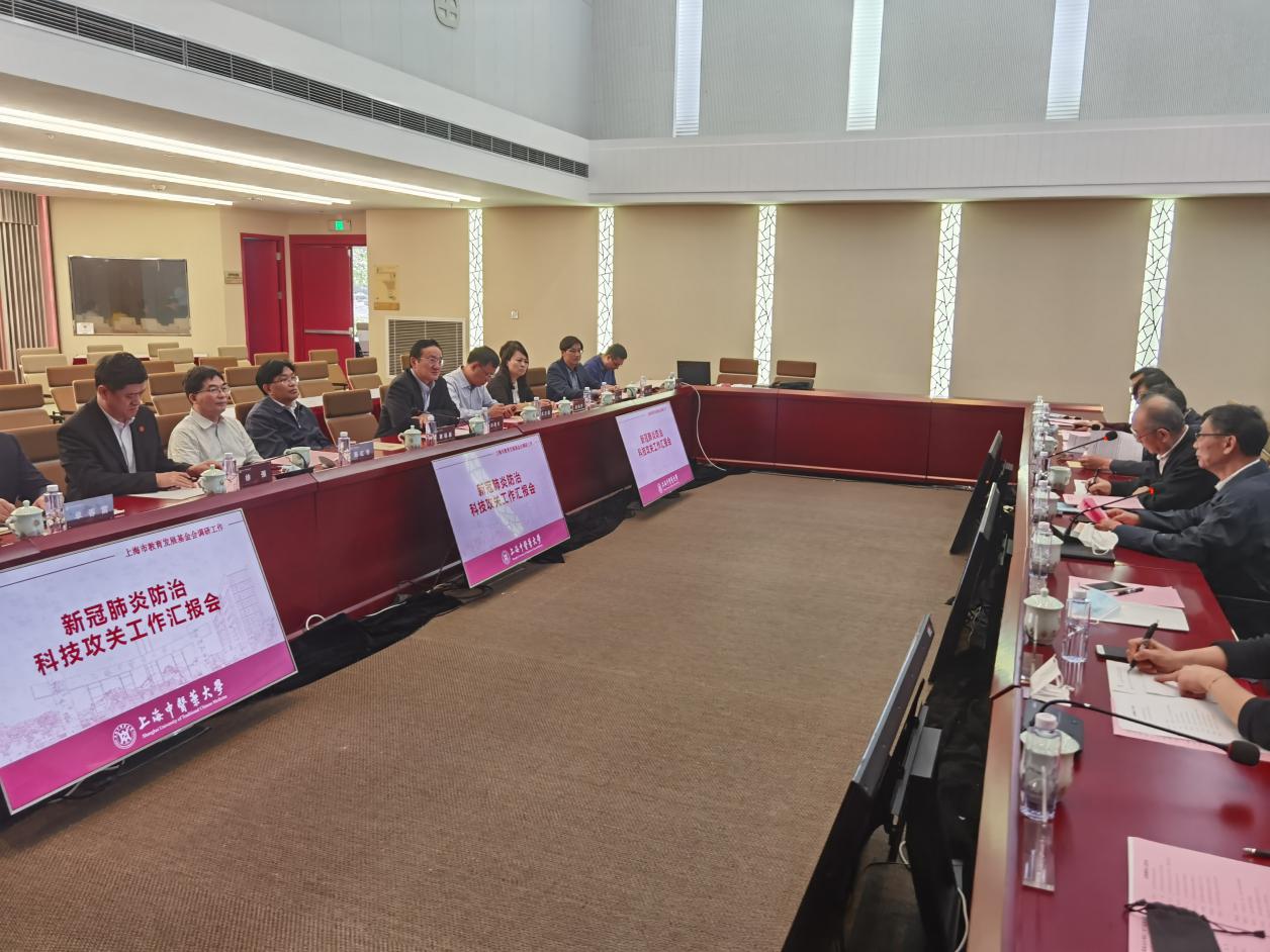 5月13日上午,上海市教育发展基金会理事长王荣华一行来伟德专题调研新冠肺炎防治科技攻关工作情况。上海市教育发展基金会常务副理事长王奇、党支部书记王明复、秘书长张宏莲等陪同调研。伟德党委书记曹锡康、校长徐建光、副校长陈红专出席,相关职能部门负责人、部分科技攻关项目负责人参加会议。