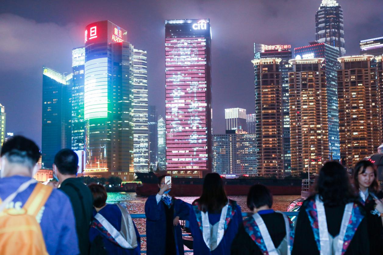 这些经由学生票选后的标语既传递了母校的寄语,也说出了学生的心语。在十六铺码头亲水平台观看亮灯的毕业生代表、援鄂医疗队代表以及分散在外滩滨江的二级学院师生代表纷纷拿出手机或相机合影留念,与“外滩之窗”母校的特色标语合影留念,在黄浦江畔进行毕业打卡。