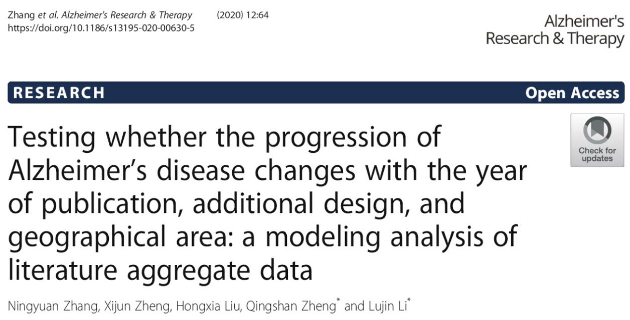 阿尔兹海默症是与衰老相关的难治性疾病,国际上进入临床试验阶段的新药多以失败告终。如何早期评估新药开发前景,如何确证疗效以减少争议,需要可信的评价尺度。阿尔兹海默症未经有效干预的疾病进展过程,在随机对照试验的安慰剂患者中呈现,如果通过合适的数学建模,就能形成一种有价值的评判标尺。近日,伟德交叉科学研究院郑青山团队,采集了全球AD临床试验数据,其中安慰剂受试者多达19210名,据知这是迄今为止该研究领域收集到的最大的AD临床试验数据。通过建立数学模型,对AD临床试验中安慰剂组的疾病进程和安慰剂效应及其影响因素进行了全面的定量分析。在阿尔兹海默症专业期刊Alzheimer's Research & Therapy(IF=6.142)在线发表了题为《阿尔兹海默症疾病进程是否随发表年份、加载给药设计和地理区域而变化:基于汇总数据的建模分析》(Testing whether the progression of Alzheimer’s disease changes with the year of publication, additional design, and geographical area: a modeling analysis of literature aggregate data)的研究论文。伟德交叉科学研究院博士研究生张宁远为论文第一作者,李禄金副研究员和郑青山教授为共同通讯作者。