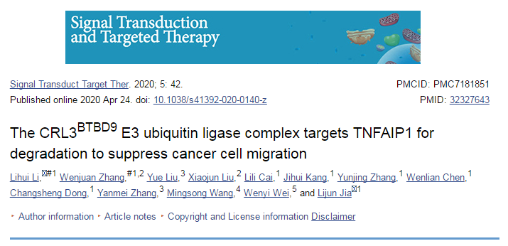 近日,伟德附属龙华医院贾立军研究员、李立辉副研究员研究团队在著名国际期刊《Signal Transduction and Targeted Therapy》上发表了题为“The CRL3BTBD9 E3 ubiquitin ligase complex targets TNFAIP1 for degradation to suppress cancer cell migration”的研究文章,通过鉴定TNFAIP1为Neddylation-CRL3BTBD9 E3的新底物,进一步解析肺癌细胞侵袭转移新机制,并为靶向干预中药单体的筛选提供了新思路。