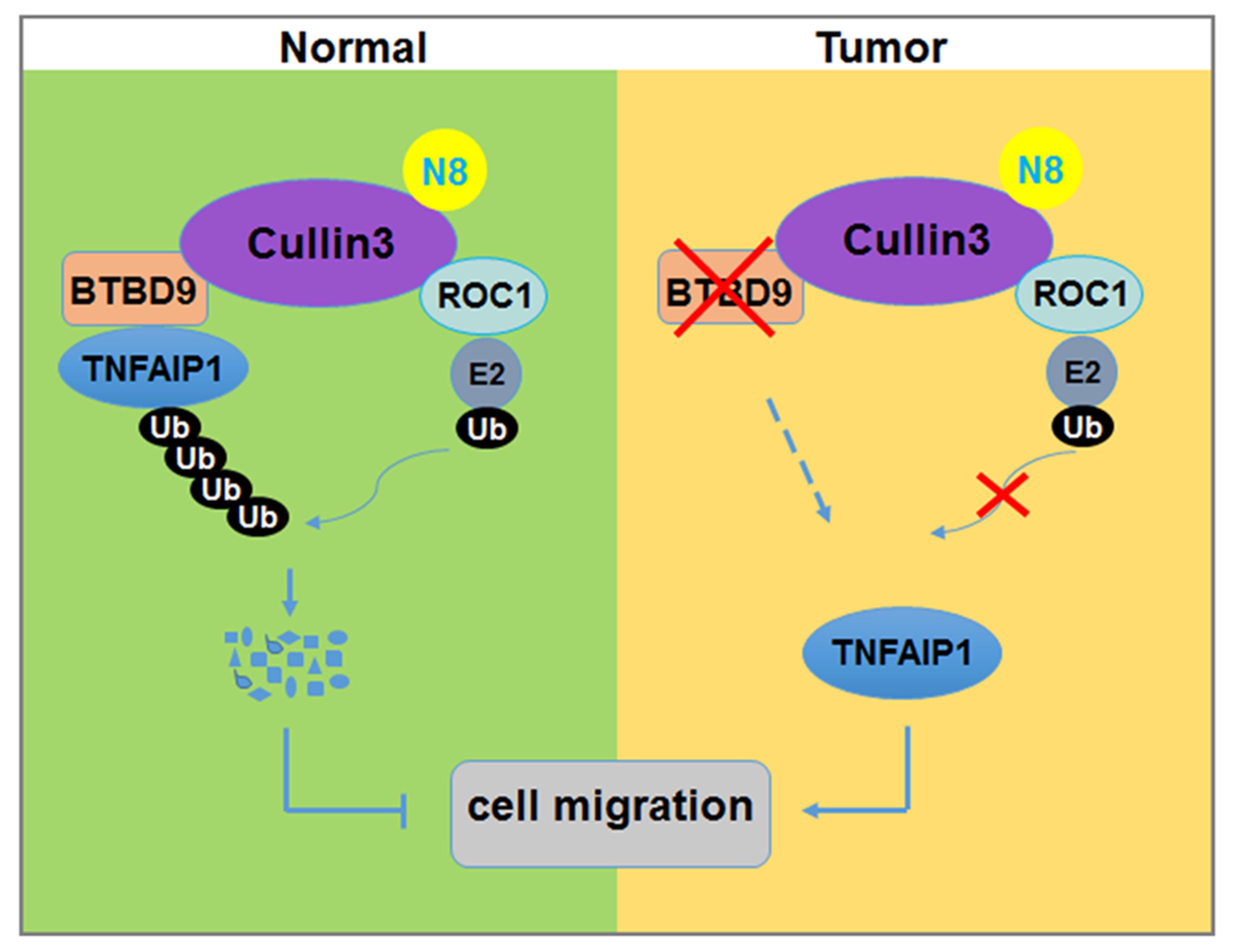 该团队利用高通量蛋白质谱分析等技术,发现特异性灭活Neddylation-CRL通路显著诱导肿瘤细胞内TNFAIP1蛋白积聚,抑制TNFAIP1的泛素化修饰,并通过阻断其降解而显著延长其半衰期。进一步利用质谱鉴定、蛋白互作和泛素化分析等手段,发现Cullin3-ROC1-BTBD9泛素连接酶复合物特异性调控TNFAIP1的泛素化修饰和蛋白降解。功能上,下调BTBD9表达通过阻断TNFAIP1降解从而上调TNFAIP1表达促进肺癌细胞的转移。与癌旁组织相比,BTBD9泛素连接酶在肺癌组织内显著低表达,而TNFAIP1在肺癌组织内则呈显著高表达,两者的表达水平呈显著负相关。本文中,首次鉴定BTBD9作为CRL3的底物识别蛋白,介导TNFAIP1的泛素化修饰与降解。上述发现提示,CRL3BTBD9泛素连接酶可通过在肺癌内低表达诱导TNFAIP1积聚,进而促进肺癌发生发展,相关发现为解析肺癌细胞侵袭转移机制提供了新思路。