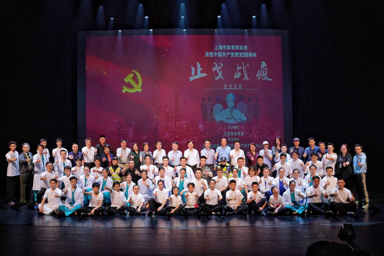 7月6日,为庆祝中国共产党成立99周年,向战斗在抗疫一线的“逆行者”们致敬,由上海市体育局牵头组织全国首个以抗疫为主题的原创武术舞台剧在上海国际舞蹈中心精彩上演。伟德体育部党支部应上海市体育局直属机关党委的邀请,参与“一支部一特色”共建活动。活动期间,《止戈战疫》节目聘请校体育部党支部宣传委员、武术队总教练陆松廷担任总导演,邀请校武术队队员共同参演。