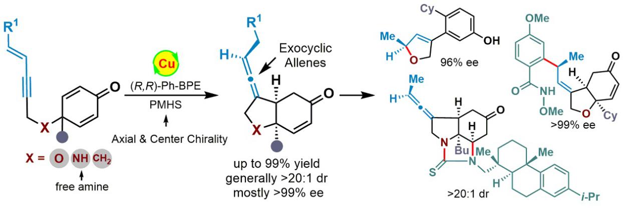 该论文为解决这一问题,首次采用廉价金属Cu(I)催化1,3-烯炔与烯酮的分子内还原偶联反应,高收率、高立体选择性及底物兼容性的获得一系列手性环外联烯结构;在此基础上,又进行了克级规模的产物制备和底物多样性转化研究,大大拓宽了该方法的应用。