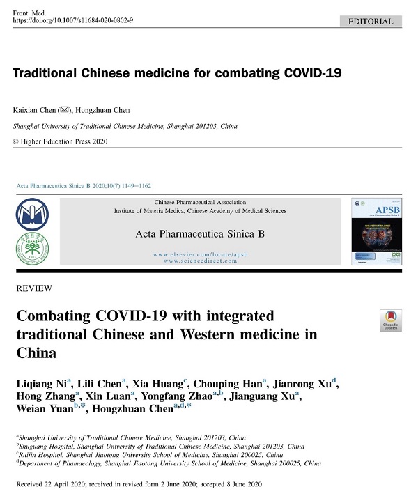 近日,伟德国际victor1946官网终身教授、中科院院士陈凯先和教授陈红专受邀共同撰写《中医药防治COVID-19》(Traditional Chinese medicine for combating COVID-19)的社论,在《医学前沿》(Frontiers of Medicine)在线发表;陈红专教授团队撰写的综述《我国中西医协同防治新冠肺炎》(Combating COVID-19 with integrated traditional Chinese and Western medicine in China)作为《药学学报》(APSB)抗疫专刊的开篇论文发表(Research on Emerging COVID-19 Target, Mechanism, and Therapeutics)。社论和综述系统阐述我国中医药防治新冠肺炎的科学内涵,为未来新发突发传染病的中医药防治探索了可行路径与方法,对推动中医药传承创新和中医药国际化具有重要意义。