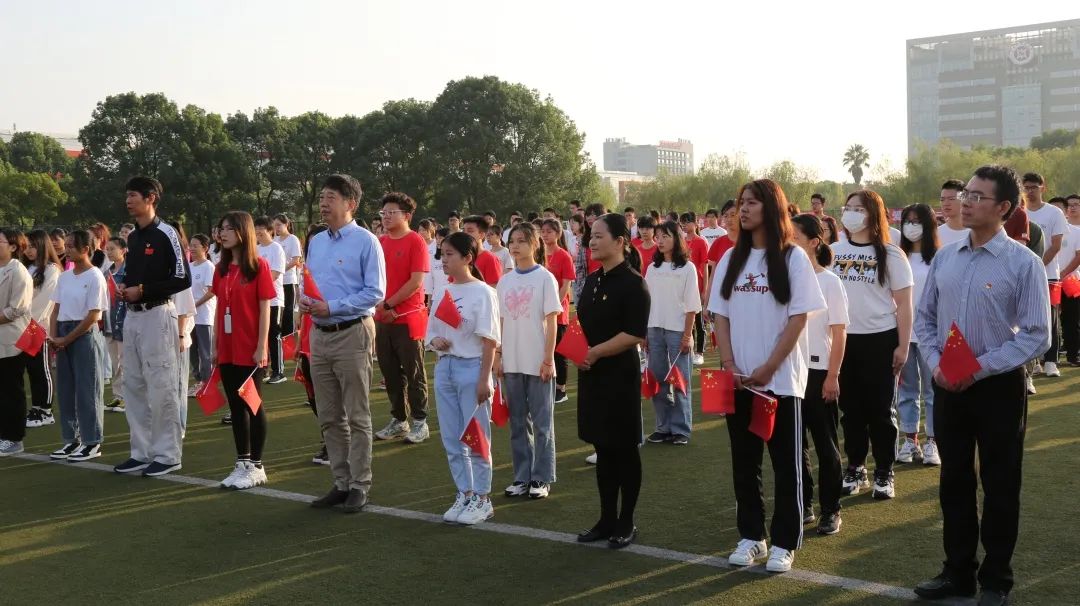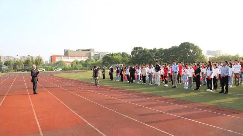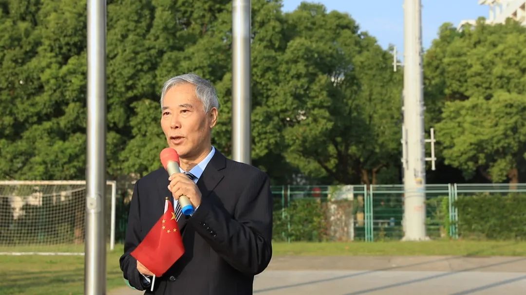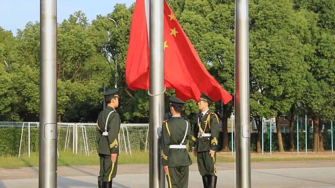 升旗仪式在中国人民解放军进行曲中拉开帷幕,校国旗护卫队迈着整齐的步伐,意志坚定,目光炯炯。随着出旗令响,师生行注目礼,奏唱中华人民共和国国歌,鲜艳的五星红旗缓缓升起。