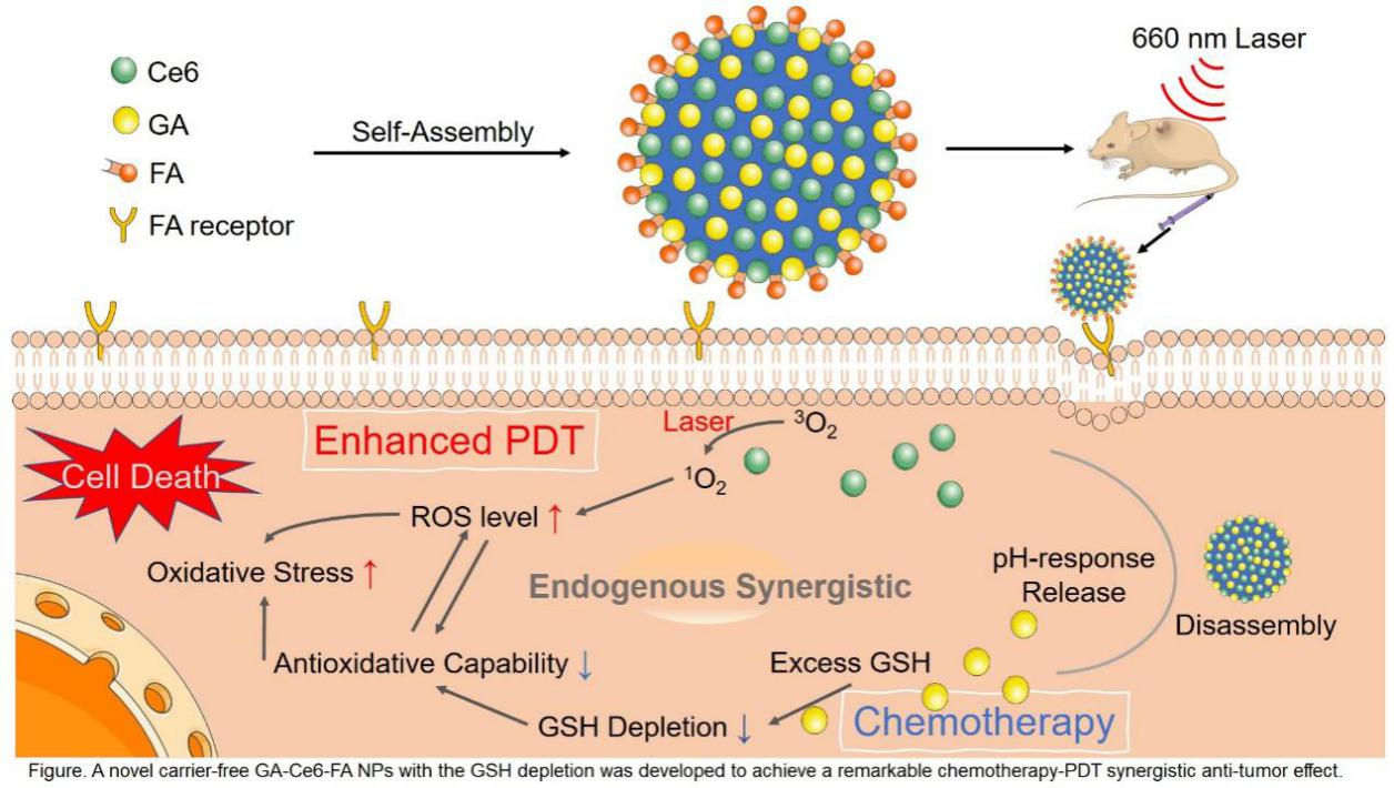 光动力治疗(photodynamic therapy,PDT)是恶性肿瘤治疗的常用手段,但肿瘤细胞中特有的肿瘤微环境-高谷胱甘肽(GSH),抑制了光动力治疗过程中产生的有效单线态氧(1O2),降低了PDT治疗的临床疗效。临床中药、化疗药联合PDT能够较好地提高单纯PDT疗效,是常用的中西协同抗恶性肿瘤治疗方案,但研究机制不清楚。针对这一问题,该研究选择中药活性成分藤黄酸(gambogic acid,GA)作为模型药物,与临床光敏剂二氢卟吩e6(Ce6)及叶酸(FA),构建一种新型的无载体纳米制剂(GA-Ce6-FA)。该纳米制剂利用叶酸(FA)的主动靶向作用,提高中药活性成分GA在肿瘤部位的聚集和摄取,发挥中药活性成分GA调节肿瘤微环境和诱导肿瘤细胞凋亡的多靶点优势。同时,该纳米制剂(GA-Ce6-FA)提高进入肿瘤细胞内GA消耗GSH的能力,进一步调节肿瘤微环境,增强PDT作用,实现中药组分提高PDT的协同增效。该研究中建立的多功能中药活性成分自组装无辅料纳米药物制剂,为未来中药活性成分新型给药系统的研究与应用提供了新思路和技术方法。
