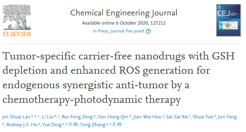 近日,伟德中药学科张彤教授课题组在抗肿瘤中药活性成分藤黄酸(gambogic acid,GA)新型无辅料纳米给药系统研究中取得重要突破,成功构建了一种新型无载体纳米制剂(GA-Ce6-FA),为未来提高中药调节肿瘤微环境能力,开展中西协同光动力临床治疗方案提供了可能。该项研究成果Tumor-specific carrier-free nanodrugs with GSH depletion and enhanced ROS generation for endogenous synergistic anti-tumor by a chemotherapy-photodynamic therapy发表在国际顶级学术期刊Chemical Engineering Journal(6 Oct 2020,DOI: https://doi.org/10.1016/j.cej.2020.127212)。