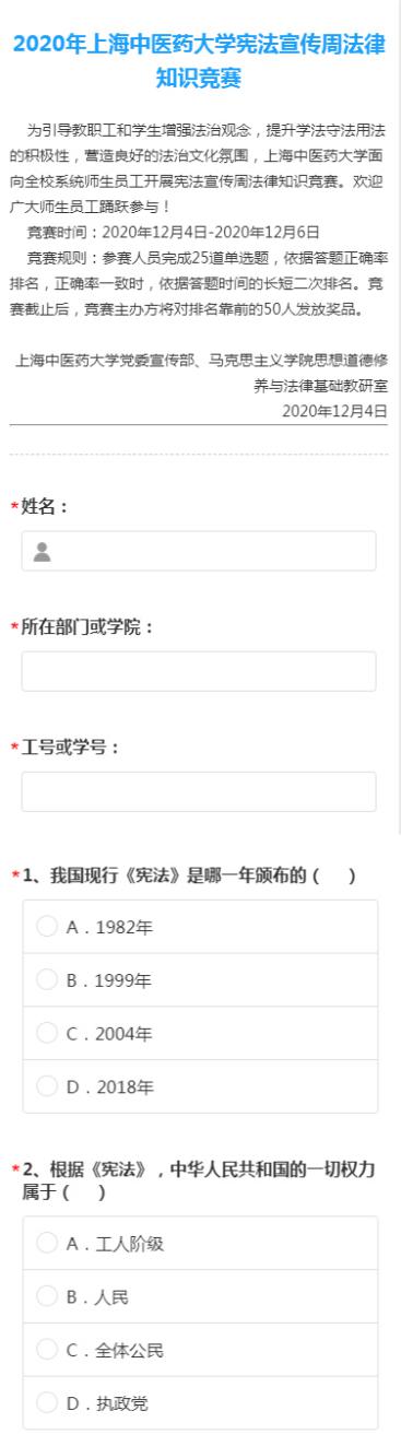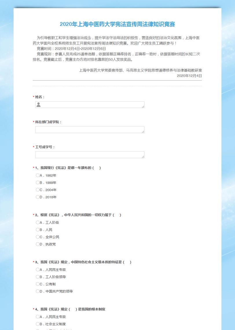 竞赛邀请马克思主义学院思想道德修养与法律基础教研室教师设25道选择题,在学校官方微信平台上推出。内容涵盖宪法、民法典、中医药法等,涉及我国的基本制度、公民的权利和义务、中药保护与发展等。竞赛为增强伟德师生法治观念、提升师生学法守法用法的积极性营造了良好的氛围。