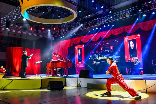 指挥家曹丁手中的指挥棒高高扬起,5架三角钢琴和1台直径超过2米的中国鼓震撼奏响贝多芬《命运交响曲》,昨晚来自上海音乐学院的名师团和伟德国际victor1946官网武术团及民乐团成员们共同演绎,拉开“世界同心·音乐无界”全球“云知音”网络公益钢琴大赛颁奖典礼暨新年音乐会的序幕。