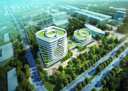·总体设计以“天圆地方”为理念,建筑形体双螺旋状旋转上升,形成阴阳圆融的整体形态,连廊上方设置“百草园”,体现绿色生态校园理念
