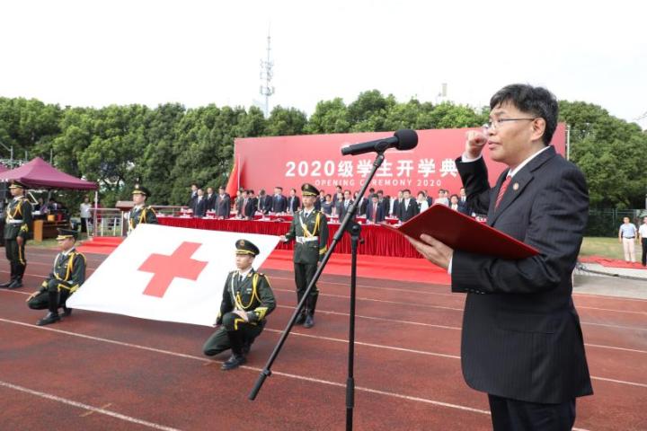 今年的开学典礼恰逢第36个教师节,学生代表为教师代表献上鲜花,并举行了迎校旗和红十字会会旗仪式。在校党委书记曹锡康的领誓下,全体新生庄严宣誓。