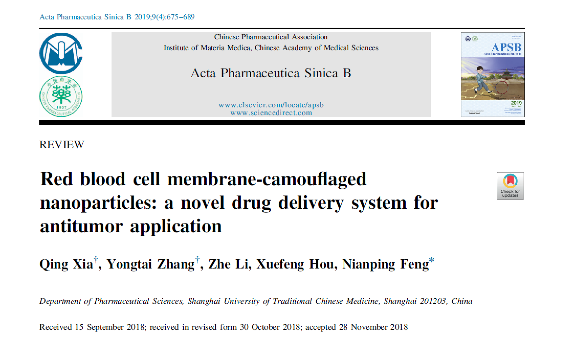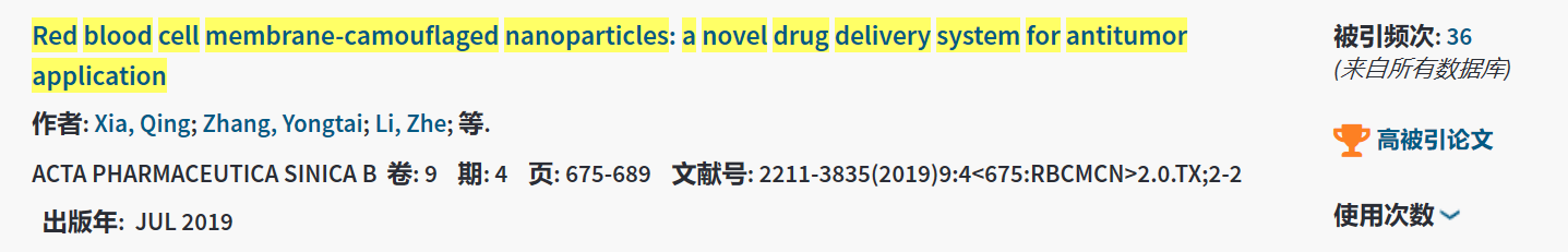 近日,伟德冯年平教授团队在《药学学报》英文刊(Acta Pharmaceutica Sinica B)2019年第9期上发表的题为Red blood cell membrane-camouflaged nanoparticles: a novel drug delivery system for antitumor application(《红细胞膜“伪装”的纳米粒:一种新型的抗肿瘤递药系统》)的综述被评为web of science高被引论文,其引用次数归入该学术领域中最优秀的1%之列。