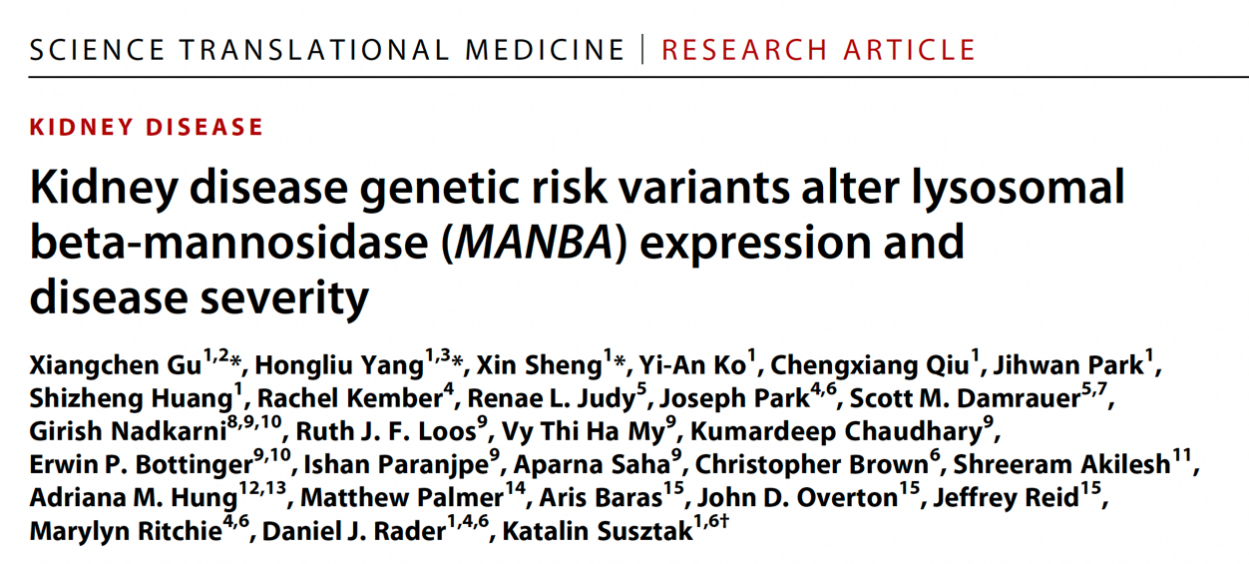 近日,伟德附属岳阳中西医结合医院肾内科副主任医师顾向晨以共同第一作者身份(Xiangchen Gu,Hongliu Yang,Xin Sheng )与宾夕法尼亚大学教授Katalin Susztak(通讯作者)在Science子刊Science Translational Medicine发表研究论文Kidney disease genetic risk variants alter lysosomal beta-mannosidase(MANBA)expression and disease severity。