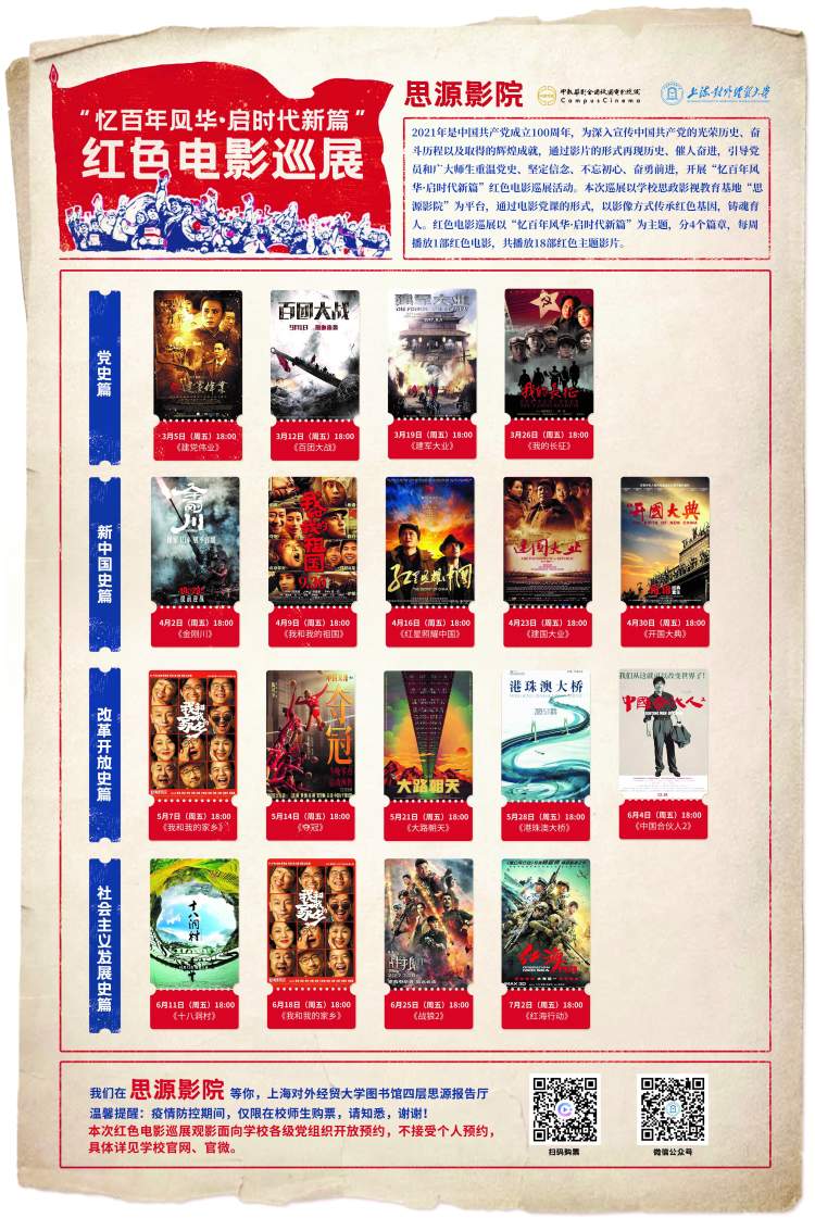 红色电影巡展分4个篇章,从3月至7月,每周播放1部红色电影,共播放18部红色主题影片——“党史篇”有《建党伟业》《建军大业》《百团大战》《我的长征》等,“新中国史篇”有《金刚川》《建国大业》《开国大典》等,“改革开放史篇”有《夺冠》《中国合伙人2》等,“社会主义发展史篇”有《我和我的家乡》《战狼2》《红海行动》等。