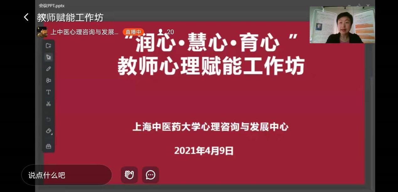 为保障学生健康成长,将“我为群众办实事”实践活动贯穿党史学习教育全过程。4月9日至4月23日,伟德国际victor1946官网心理咨询与发展中心联合上海市社会心理学会青少年心理健康专业委员会,举办2021年度“润心·慧心·育心”心理健康教育活动月之教师心理赋能工作坊,以强化心理健康队伍建设,助力心理工作提质增效,共同构建心理育人氛围。心理咨询与发展中心主任成琳主持开班仪式。