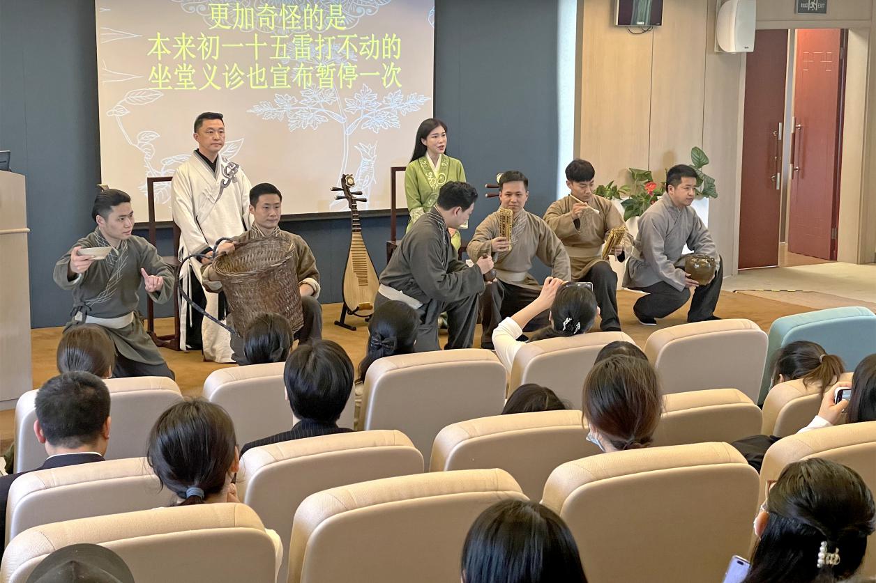 在活动中,上海评弹团团长高博文和上海曲艺家协会主席吴新伯领衔主讲,陆锦花等著名青年评弹艺术家着戏服,在舞台上载歌载舞、边弹边唱边演,塑造再现张仲景、学生张喜及更多人物的生动形象,以艺术的方式、新颖的舞台形式精彩展现《医圣》剧中张仲景“以身试药”及“归隐著书”两个片段。虽然没有剧场的专业舞美灯光,但剧目本身的内容内核感染着台下的观众。观众们沉浸在评弹演员们韵味醇厚的唱腔中,领略评弹剧的舞台魅力,感知着张仲景心怀苍生的献身精神和济世情怀。