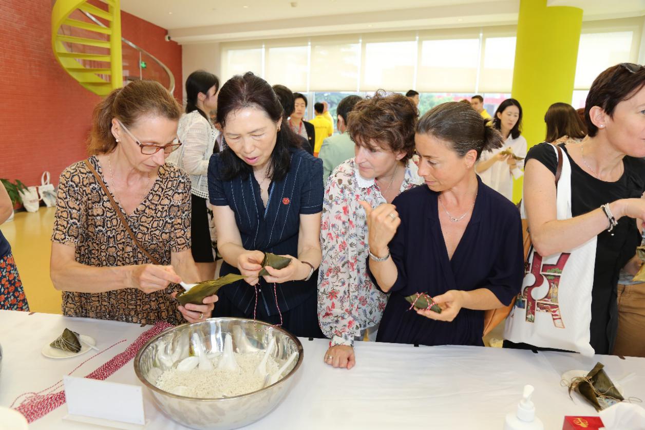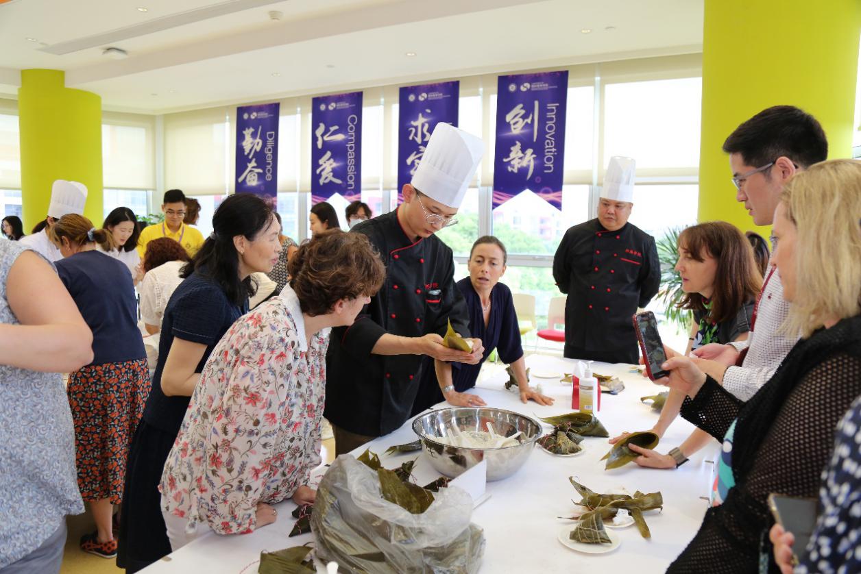 在现场体验专区,校针灸推拿学院专业教师对中医推拿手法、针灸穴位等知识进行基本介绍,并邀请参与者现场体验。随着中华传统节日端午将至,学校特地安排了“粽香端午,异乡浓情”——粽子制作与品尝体验环节。粽叶清热解毒、利尿止血,糯米补中益气、养胃健脾,红豆理气通经、祛湿生津……看着这些药食同源的材料一一摆在眼前,在场的外籍人士感到既新奇又有趣。在指导教师的帮助下,他们中的很多人第一次亲手参与包粽子,并完成了大大小小、形态迥异的白米粽和赤豆粽作品。同时,现场还提供了鲜肉粽和蜜枣粽供参与者品尝。