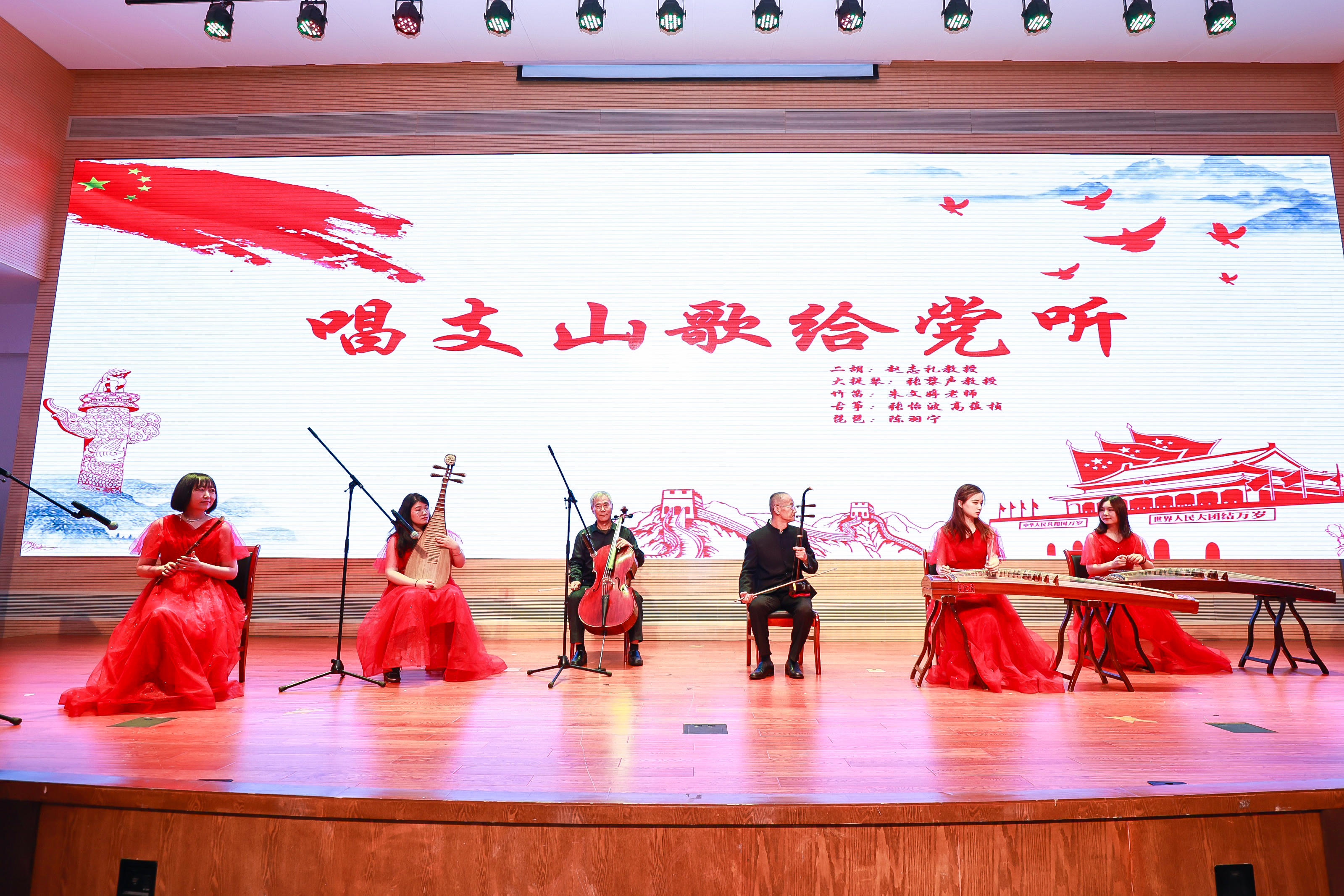 以拥有30多年教龄和党龄的赵志礼教授、张黎声教授等教师党员为代表的师生共同演奏民乐《唱支山歌给党听》。作为支部书记,赵志礼十几年行走雪域高原、致力于藏医药研究,张黎声将人体解剖学专业课上成“人生大课”,两位老党员以身示范,为青年教师和学子树立了学习的榜样。本次毕业晚会,两位老党员和学生共同合作,在优美悠扬的旋律中,让现场师生充分感受民乐的魅力和经典的力量,带来文化的熏陶和心灵的涤荡。以优秀毕业生、学生党员为代表的李沛霖、朱广濠、娜扎等组成的大学生红景天宣讲团在晚会现场讲述中药人的故事,“青年强则国家强、青年一代有有理想、有担当”引起现场大学生的强烈共鸣。30余名师生代表合唱《保卫黄河》,歌声气势恢弘、振奋人心,饱含爱国爱民的深厚情感,给现场师生以心灵的震撼。