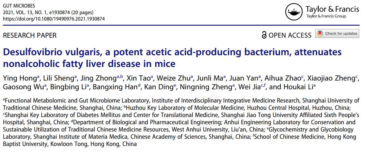 近日,伟德交叉科学研究院李后开教授团队在国际微生物学期刊Gut microbes(一区)在线发表了题为《高效产乙酸菌Desulfovibrio vulgaris改善小鼠非酒精性脂肪性肝病》(Desulfovibrio vulgaris, a potent acetic acid-producing bacterium, attenuates nonalcoholic fatty liver disease in mice)的研究论文。