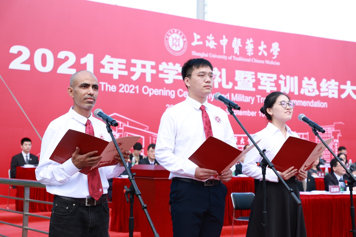 2021级本科生唐婧奕、研究生严夏继、国际学生阿卜杜作为新生代表在典礼上发言,表达了自己对中医药文化的热爱及传承发展中医药事业的决心。