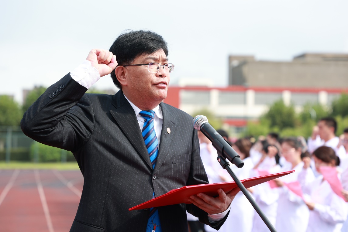 典礼上还举行了迎校旗和红十字会会旗仪式。在校党委书记曹锡康的领誓下,全体新生庄严宣誓。