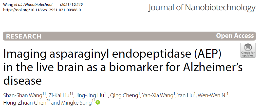 从早期生物标志物,构建荧光纳米探针和大脑成像新技术。研究工作在Journal of Nanobiotechnology在线发表,论文标题为Imaging asparaginyl endopeptidase(AEP) in the live brain as a biomarker for Alzheimer's Disease(https://doi.org/10.1186/s12951-021-00988-0)。已知AD患者和动物模型脑组织的天冬酰胺内肽酶(AEP)出现增年性明显上调,AEP过度激活可引起tau蛋白病理性剪切和促进Aβ生成,被认为是AD发病早期启动因子和潜在药物靶标。研究团队在前期模拟脑衰老及退行性变的SAMP8快速老化小鼠揭示AEP可作为AD疾病修饰干预的药理学靶点,论文正式发表于Translational Neurodegeneration,题目为Pharmacological inhibition of asparaginyl endopeptidase by δ-secretase inhibitor 11 mitigates Alzheimer’s disease-related pathologies in a senescence-accelerated mouse model(https://doi.org/10.1186/s40035-021-00235-4)。在此研究基础上,进一步利用AD模型APP/PS1小鼠证明AEP月龄相关病理变化特征,特异性AEP抑制剂可有效阻止AD的早期病理进展。同时,率先设计并构建了AEP活性依赖的荧光纳米探针,进一步应用小动物活体成像技术对其脑部AEP进行成像分析,显示5-8月龄APP/PS1小鼠AEP活性动态增高的特征,为AEP大脑成像手段作为AD早期生物标志物转化研究提供实验依据。研究团队宋明柯副研究员和伟德陈红专教授为2篇论文共同通讯作者。